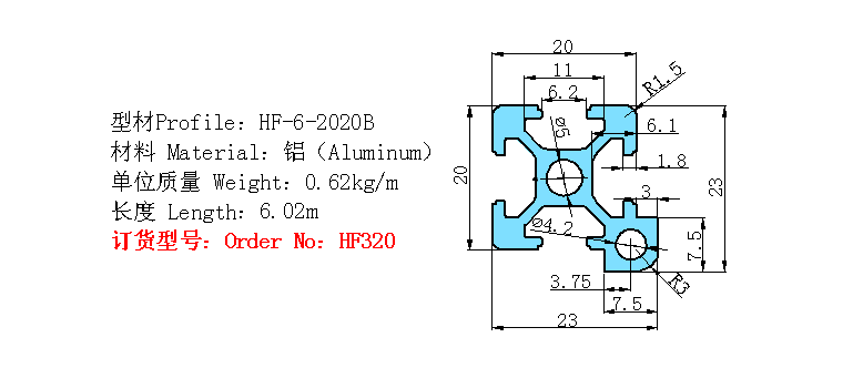 型號:HF320包裝:無紡布+牛皮紙包裝氧化膜厚度:12um以上硬度值:10HW以上產(chǎn)品介紹作用:這款鋁型材主要適用于輕型結(jié)構(gòu)的框架組合。例如機罩,儀器機架,展示欄等。其中一角多出一個圓孔是為了方便安裝螺絲。特點:槽寬為6毫米,表面經(jīng)過陽極氧化銀白處理(噴砂白和光亮白),美觀又大方。這款鋁型材通常采用20系列M5......